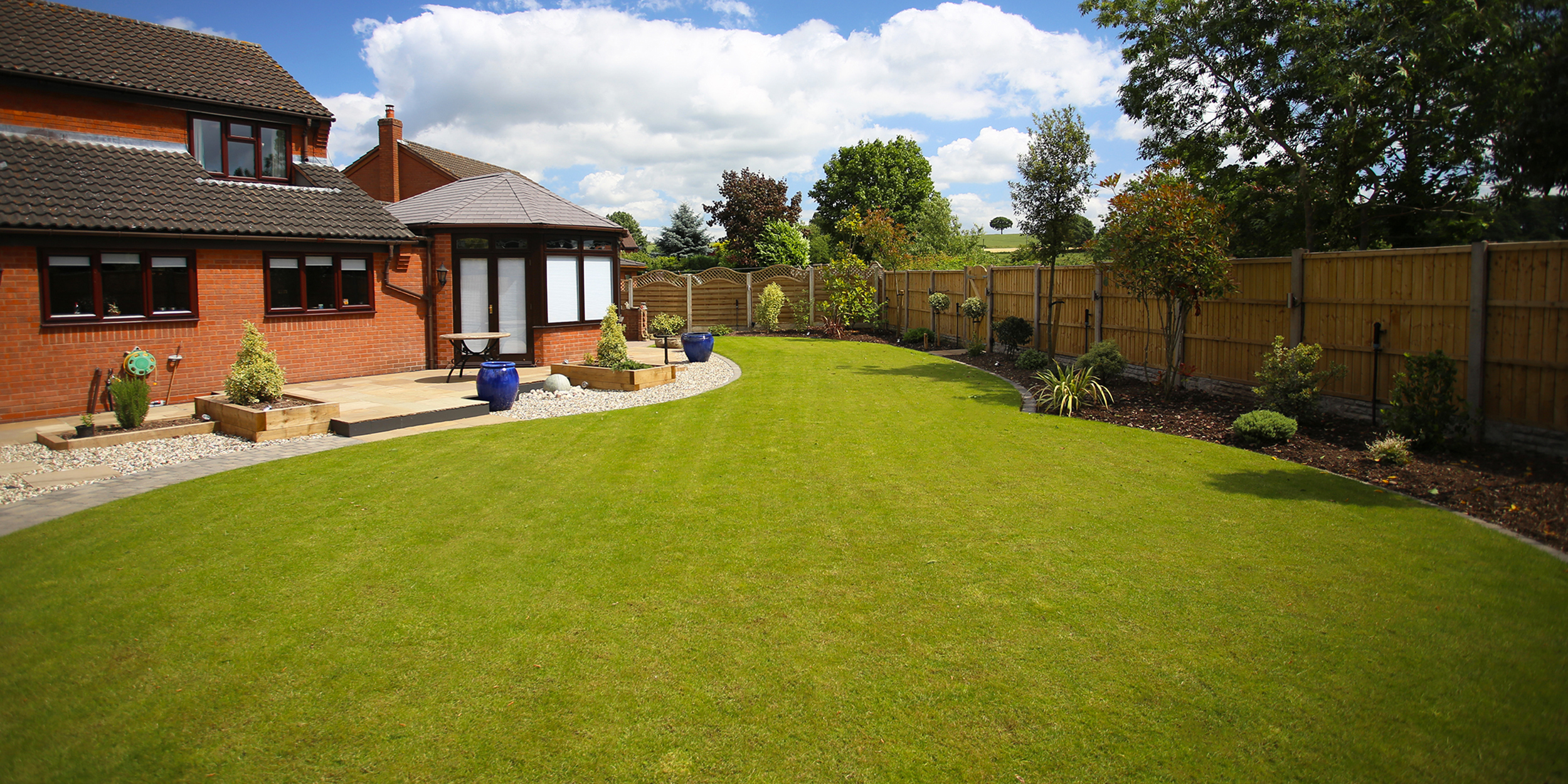 A lush lawn framed by a carefully selected patchwork of shrubbery and planting.
